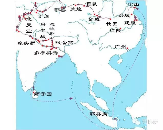 (法显西行线路图:从长安出发,由牢山登陆返国)