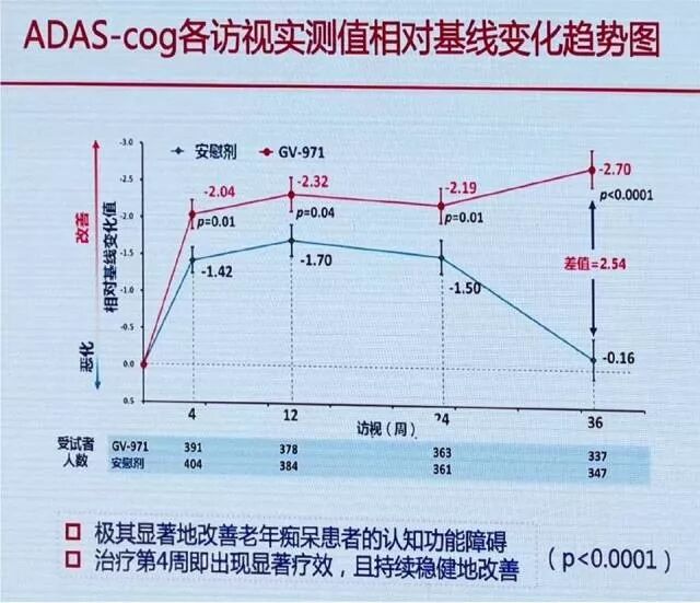 图 | 一些业内人士对这张数据表示不理解:安慰剂组和GV-971组竟然都可以立即改善认知能力,且到36周时安慰剂效应突然消失。